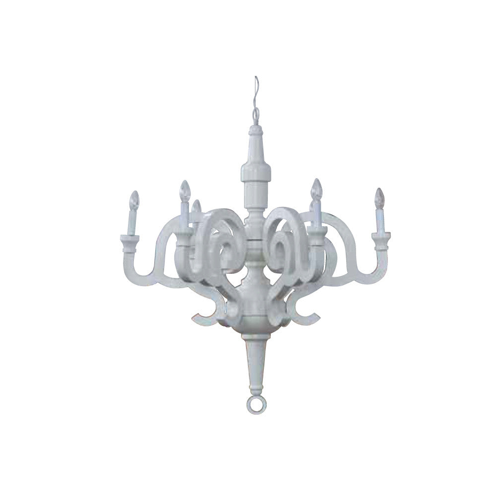 Este modelo està fabricado en madera y terminado en blanco al alto brillo , seis luces, usa foco con entrada a socket E12